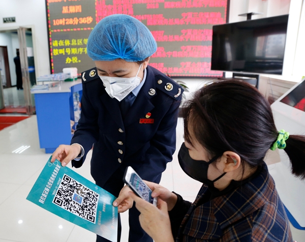 永宁县税务局办税服务厅干部为电话预约前来开具发票的纳税人,通过扫描二维码宣传防控新冠肺炎疫情税收优惠政策。(鲁丹)