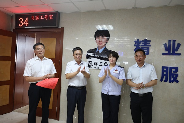 7月17日上午,银川市税务局“马丽工作室”在银川市市民大厅D5厅揭牌,自治区税务局党委委员、副局长、一级巡视员李戈同志,银川市审批服务管理局党组书记、局长井胜同志,银川市总工会党组成员、副主席黄建华同志参加揭牌仪式。