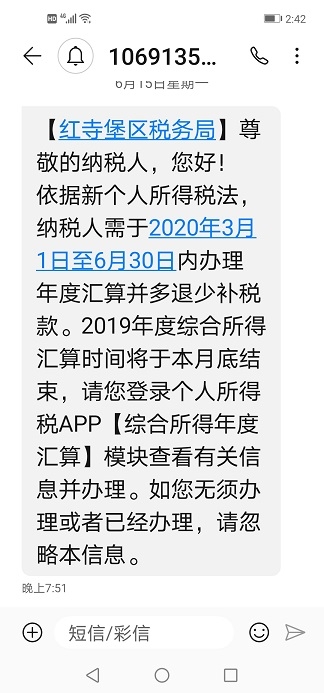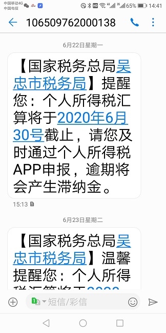 今年6月份,是新个人所得税实施汇算第一年的第一次。时间紧,任务重,广大自然人面对新的个人所得税6项附加扣除政策还有许多疑虑。有的主动汇算,有的不问不知;有的置之不理。直接影响汇算的进度和质量。吴忠市税务局根据纳税人的实际需求,想纳税人之所想,急纳税人之所急,主动作为,提早谋划,有针对性地将汇算截止时间再次告诉自然人,提醒纳税人配合税务机关做好汇算工作。选准全市自然人持电话号码较多的移动、电信公司平台,为纳税人送上温馨的告知提醒。