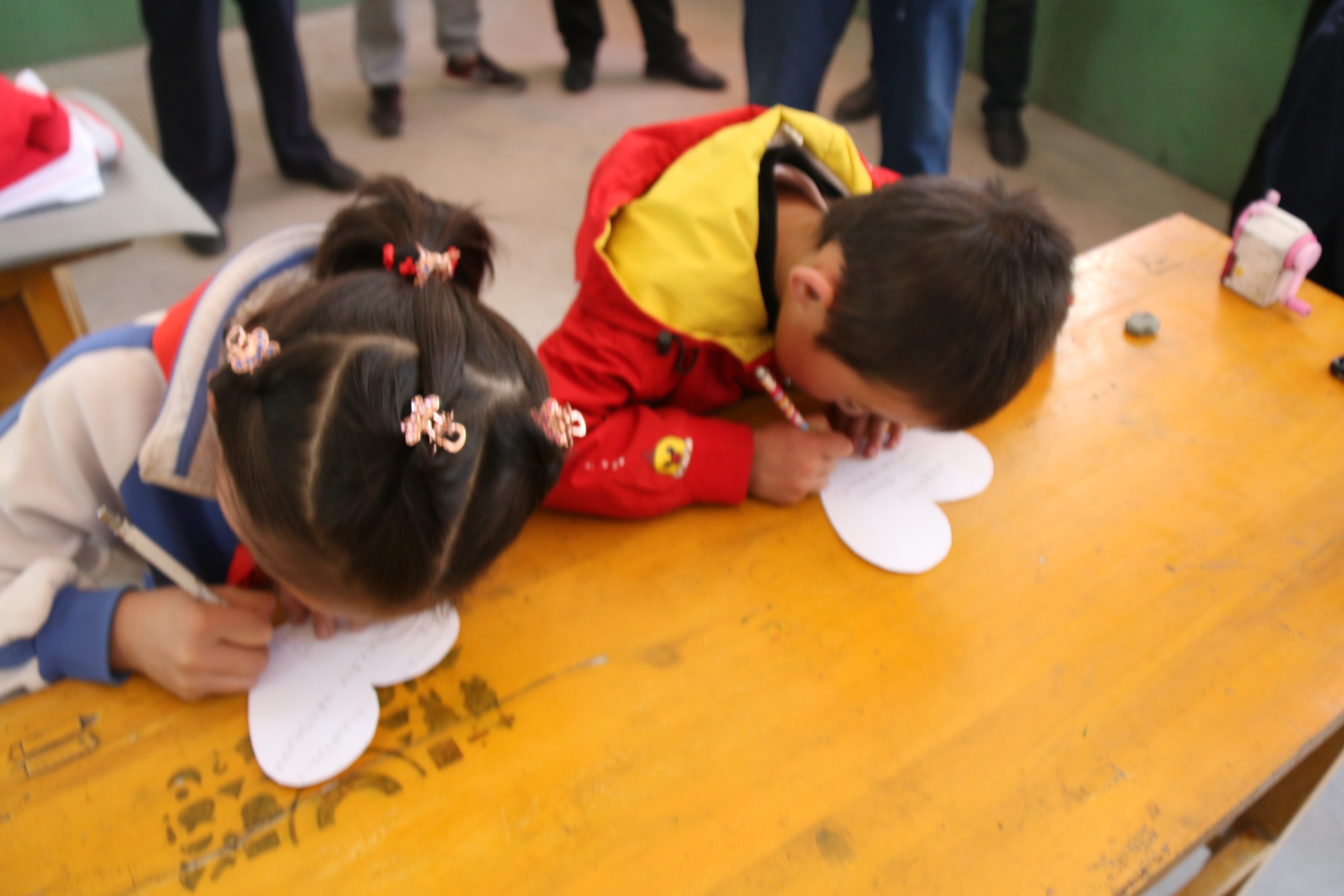 写一句心语给党听。活动最后,通过听故事唱红歌孩子们拿起手中的笔用稚嫩的字体写下了对祖国妈妈想说的心里话,“没有共产党就没有新中国,中国在共产党的正确领导下,一步步走向繁荣,我为自己是中国人而感到骄傲...”,三年级马金国工整的在卡片上写到,他们年龄虽小,但字里行间都承载着对祖国的热爱和担当。