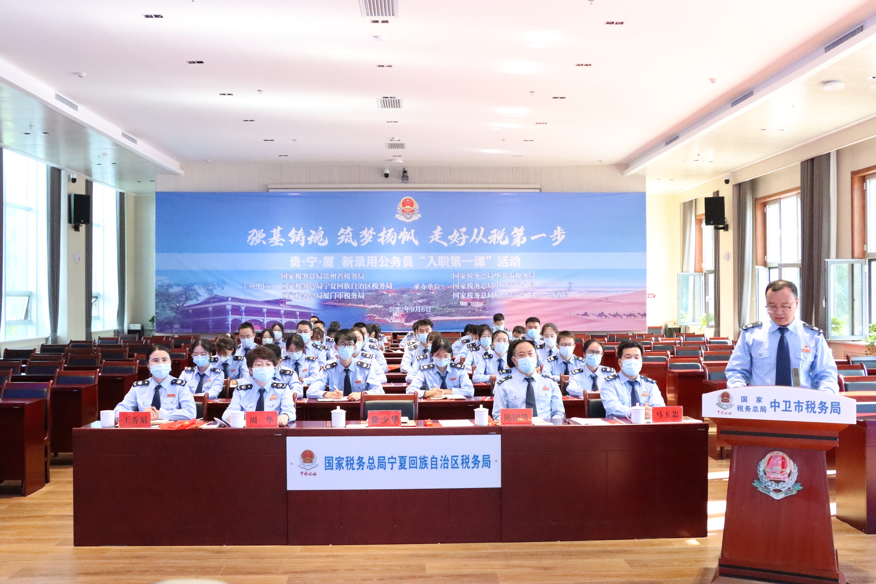 9月6日,在迎来一批新录用公务员之际,贵州、宁夏、厦门三地税务系统云端相联,山海相邀,携手开展“入职第一课”联学活动。以“强基铸魂 筑梦扬帆 走好从税第一步”为主题,通过远程视频连线、实景直播的形式,帮助新录用公务员“扣好入职第一粒扣子”,引导税务青年提高政治能力、增强履职本领,坚定税务青年全力投身税收现代化建设的理想信念,接续谱写税务东西部协作的崭新篇章。(图/鲁惠 文/马玉忠)
