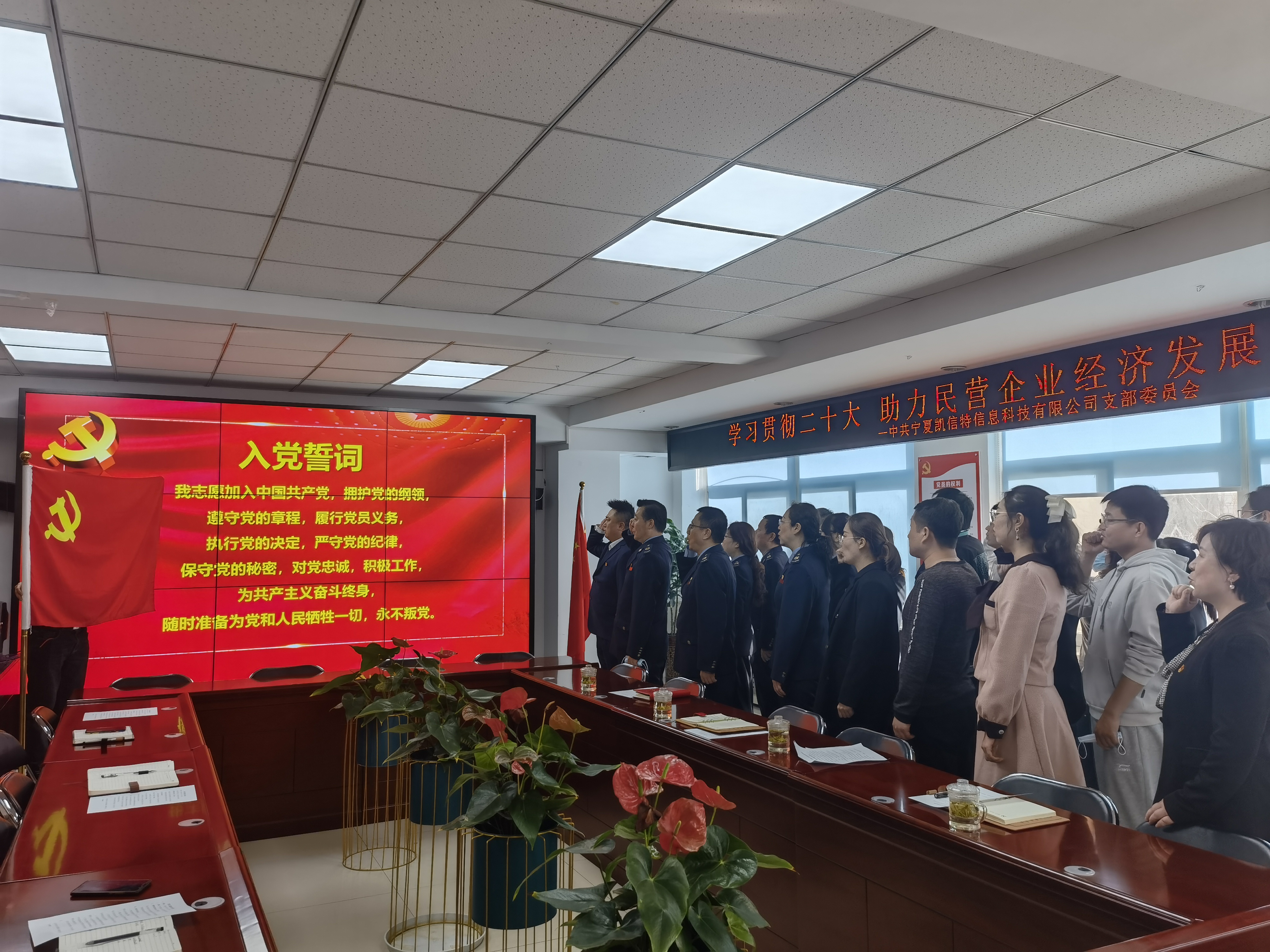 近日,银川经济技术开发区税务局税务干部深入宁夏凯信特信息科技有限公司走访调研,在送上税收政策的同时,和企业开展党建共建,重温入党誓词。
