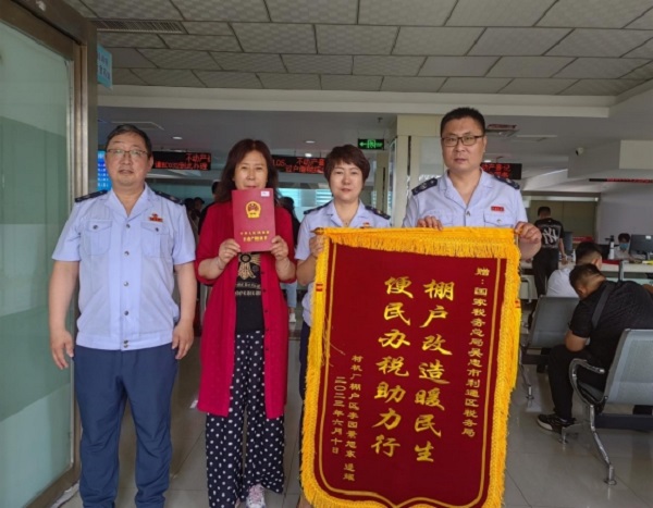 “今天送锦旗是对咱们利通区税务局在处置相关历史遗留办证难问题中心系百姓、为民解忧表达真诚的感谢,你们真正做到了全心全意为人民服务,让我们住了10多年的房子终于有证了!”6月15日,材机厂棚户区居民将一面印有“棚户改造暖民生 便民办税助力行”的锦旗送到了利通区税务局第一税务分局。