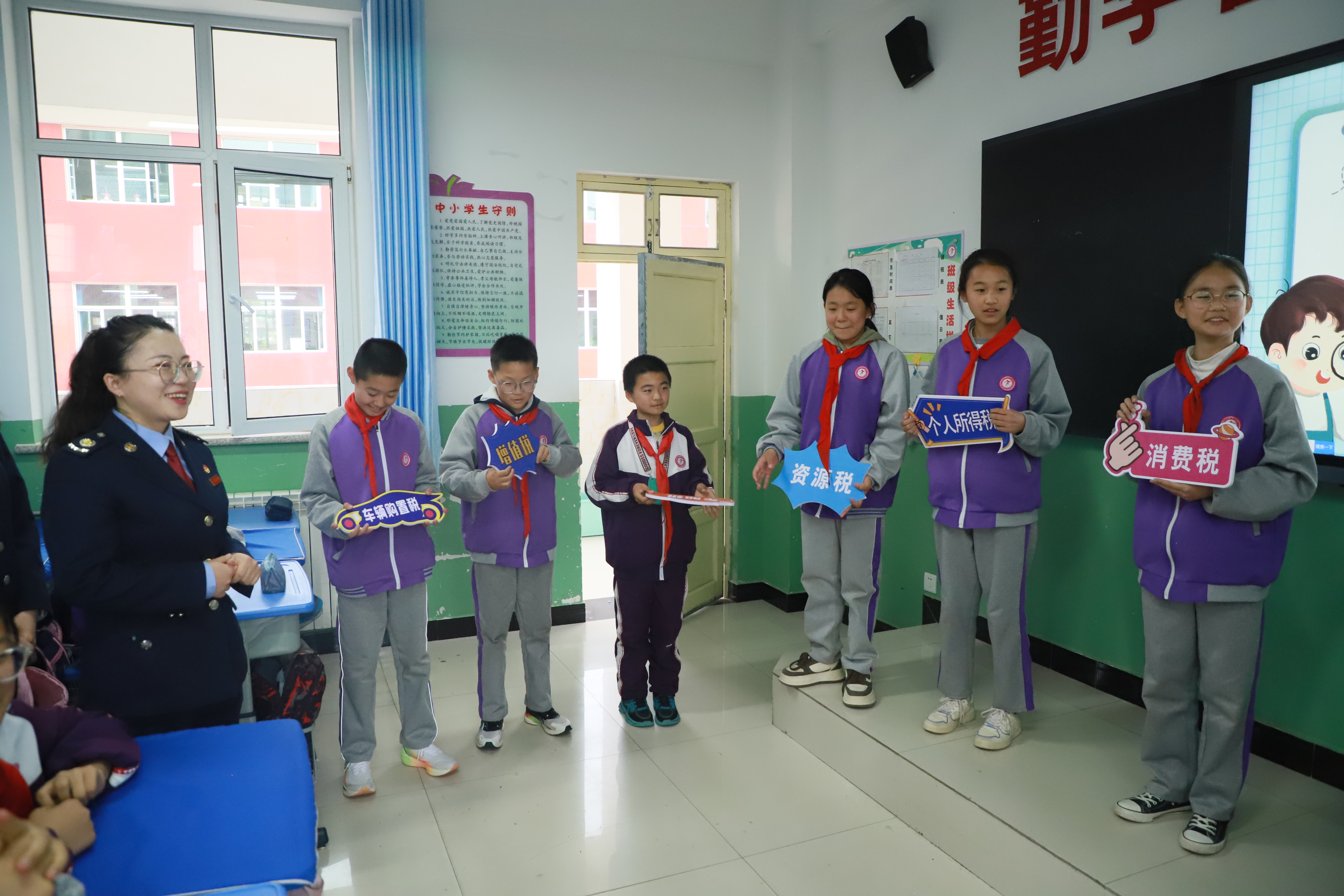 芳菲四月,宁夏固原经济开发区税务局以开展第33个全国税收宣传月为契机,聚焦“税助发展 向新而进”主题,组织税务干部走进原州区第十八小学,以税法小课堂、“税种萝卜蹲”、参观智慧办税服务厅等形式丰富的税收宣传活动,宣讲税收知识,宣传税收政策,在青少年学生心中播下“学税、懂税、护税”的种子。