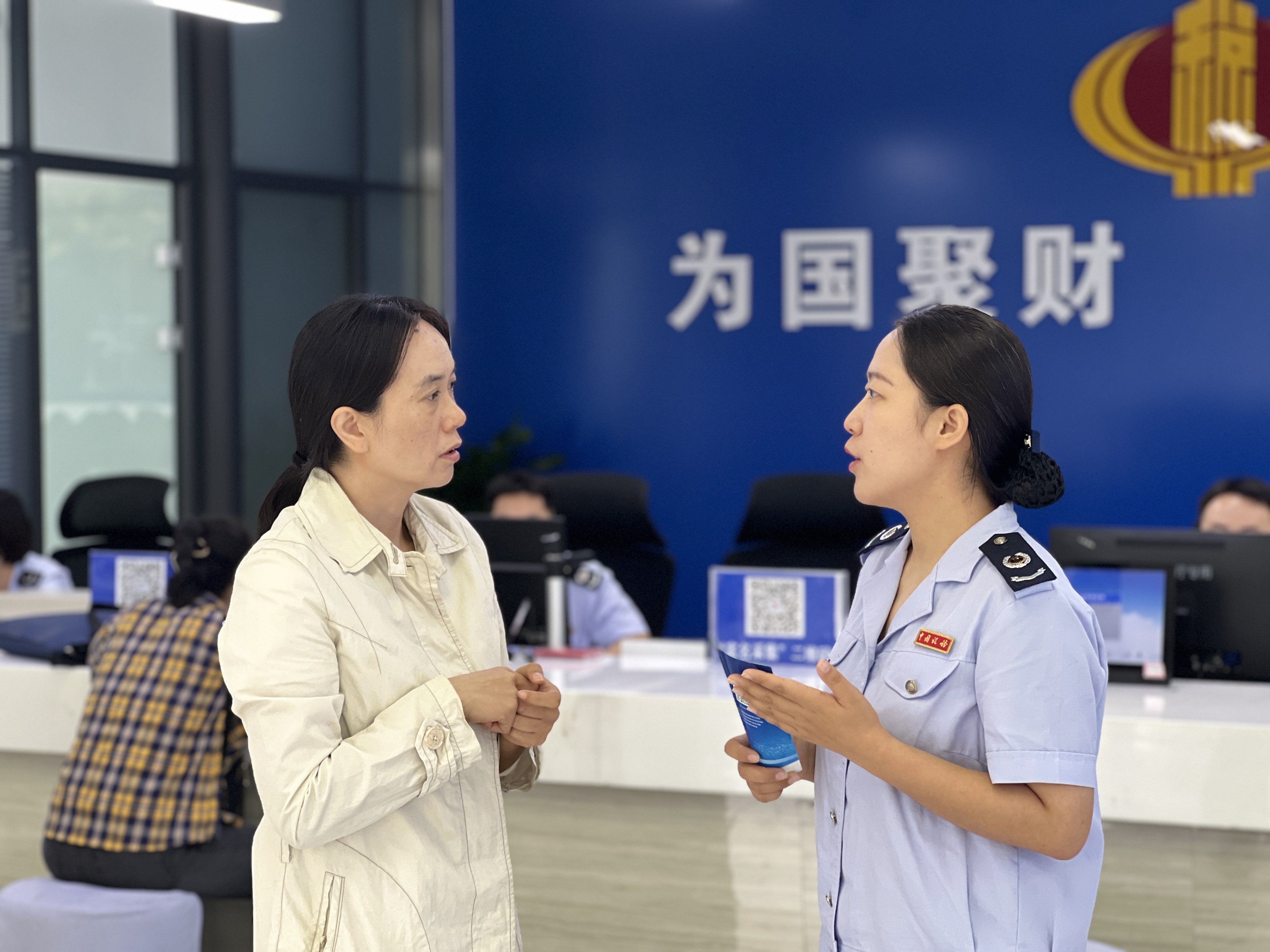 银川经济技术开发区税务局坚持以纳税人缴费人需求为导向,不断改进工作方法,在人才队伍建设、大厅转型升级、提升服务质效上多点发力,推动纳税服务和办税效率持续提档升级,纳税人满意度和获得感得到有效提升。图为办税服务厅导税人员为纳税人耐心讲解业务流程。