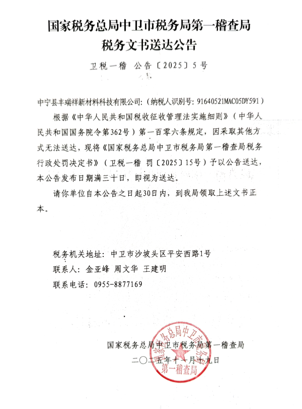 根据《中华人民共和国税收征收管理法实施细则》第一百零六条规定,国家税务总局中卫市税务局第一稽查局因采用其他送达方式无法向中宁县丰瑞祥新材料科技有限公司送达税务文书,现公告送达,自公告之日起30日内到我局领取文书,逾期视为送达。