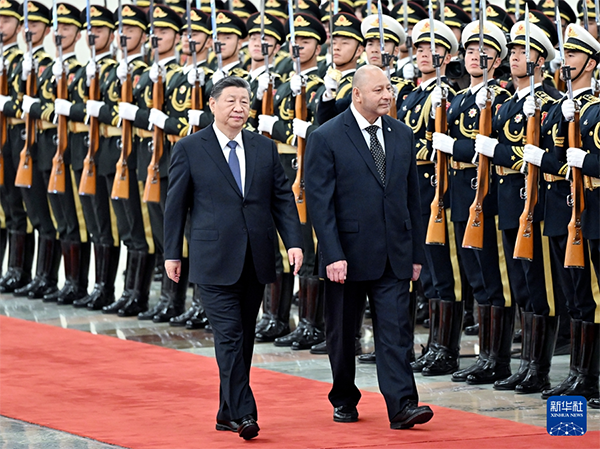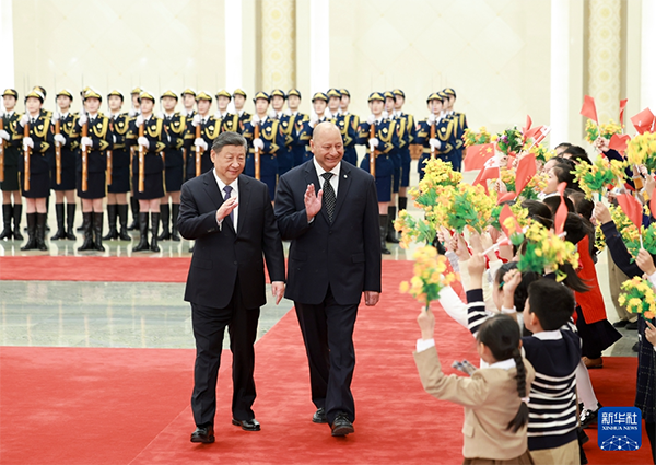 会见前,习近平和夫人彭丽媛在人民大会堂北大厅为图普六世和王后娜娜茜帕乌举行欢迎仪式。