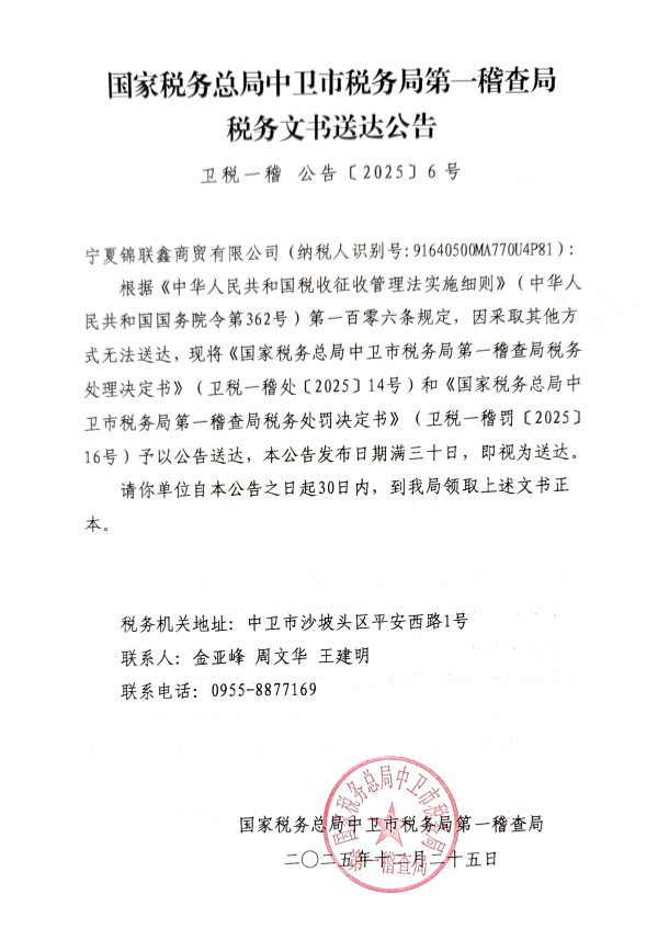 根据《中华人民共和国税收征收管理法实施细则》第一百零六条规定,国家税务总局中卫市税务局第一稽查局因采用其他送达方式无法向宁夏锦联鑫商贸有限公司送达税务文书,现公告送达,自公告之日起30日内到我局领取文书,逾期视为送达。