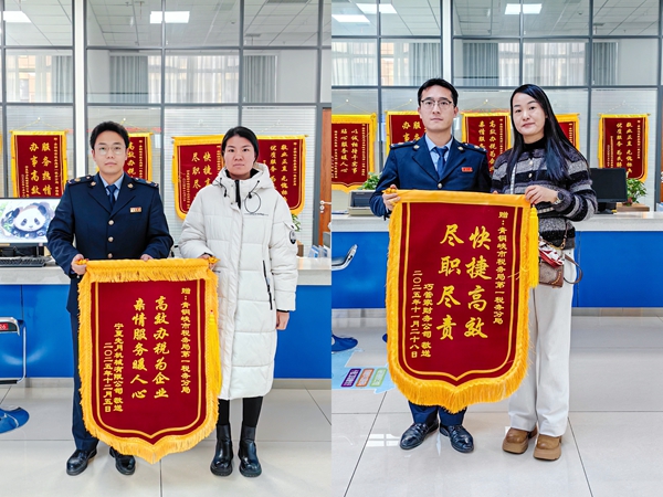近日,青铜峡市税务局办税服务大厅接连收到纳税人送来的两面锦旗。“高效办税为企业 亲情服务暖人心”“快捷高效 尽职尽责”,这不仅是对税务干部专业素养与高效服务的高度肯定,更是税务部门持续深化纳税服务、优化营商环境、提升服务质效的生动缩影。(图/周家安 张斌 文/王彬)
