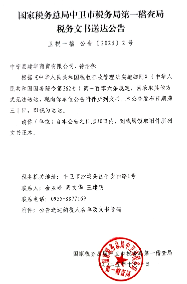 根据《中华人民共和国税收征收管理法实施细则》第一百零六条规定,国家税务总局中卫市税务局第一稽查局因采用其他送达方式无法向中宁县建华商贸有限公司、徐治存2户纳税人送达税务文书,现公告送达,自公告之日起30日内到我局领取文书,逾期视为送达。