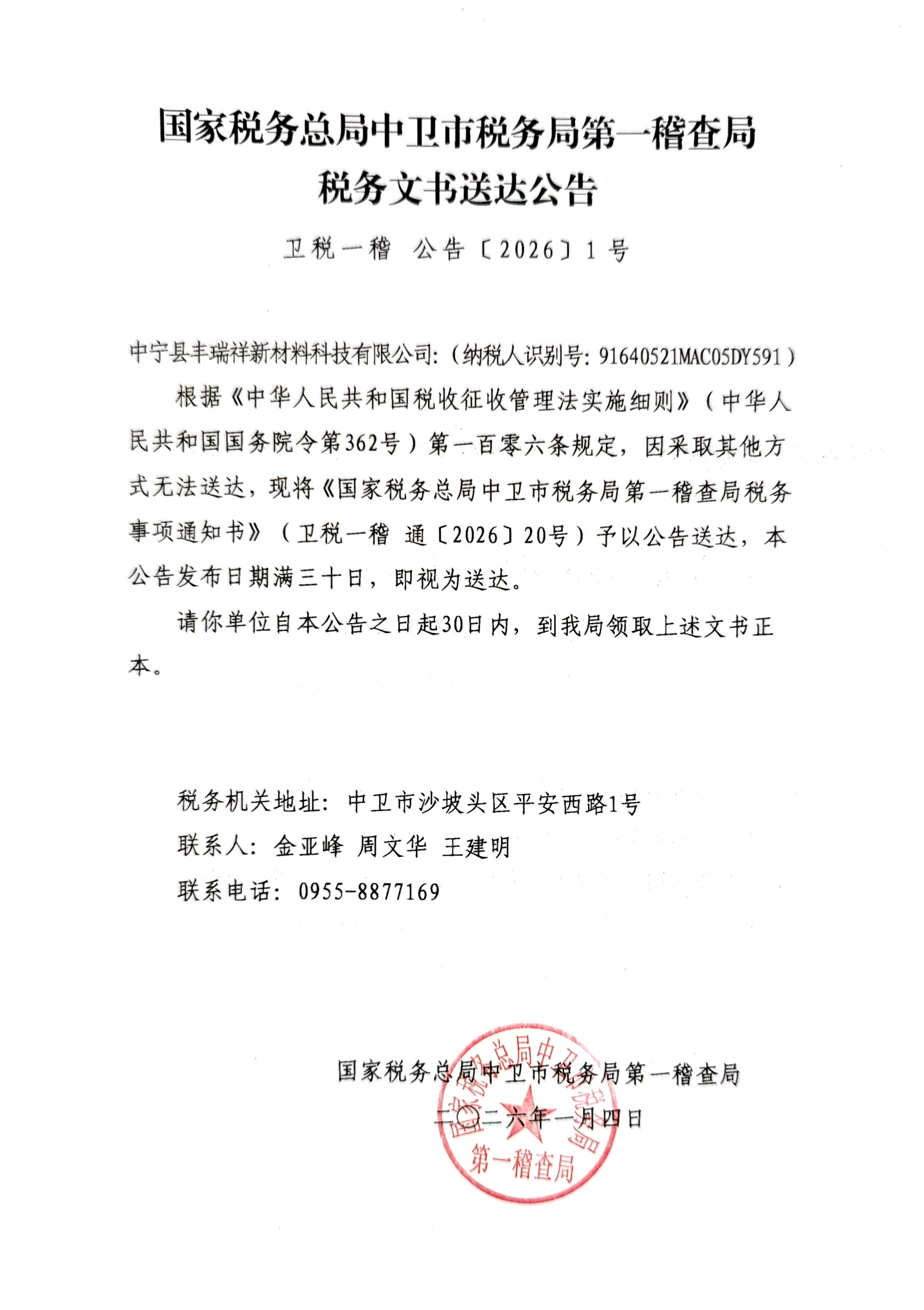 根据《中华人民共和国税收征收管理法实施细则》第一百零六条规定,国家税务总局中卫市税务局第一稽查局因采用其他送达方式无法向中宁县丰瑞祥新材料科技有限公司送达税务文书,现公告送达,自公告之日起30日内到我局领取文书,逾期视为送达。