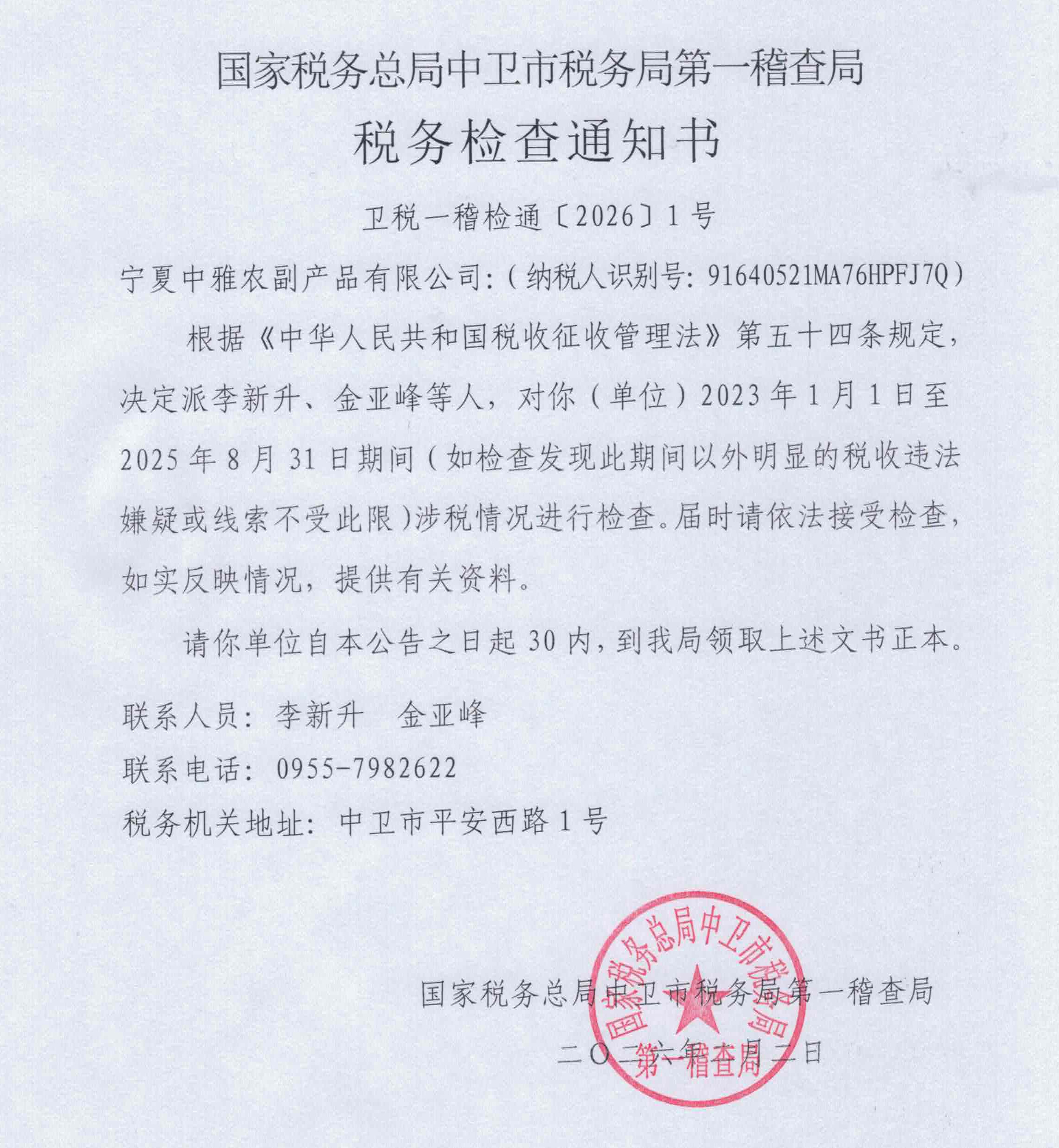 根据《中华人民共和国税收征收管理法实施细则》第一百零六条规定,国家税务总局中卫市税务局第一稽查局因采用其他送达方式无法向宁夏中雅农副产品有限公司送达《税务检查通知书》,现公告送达,自公告之日起满30日,即视为送达。