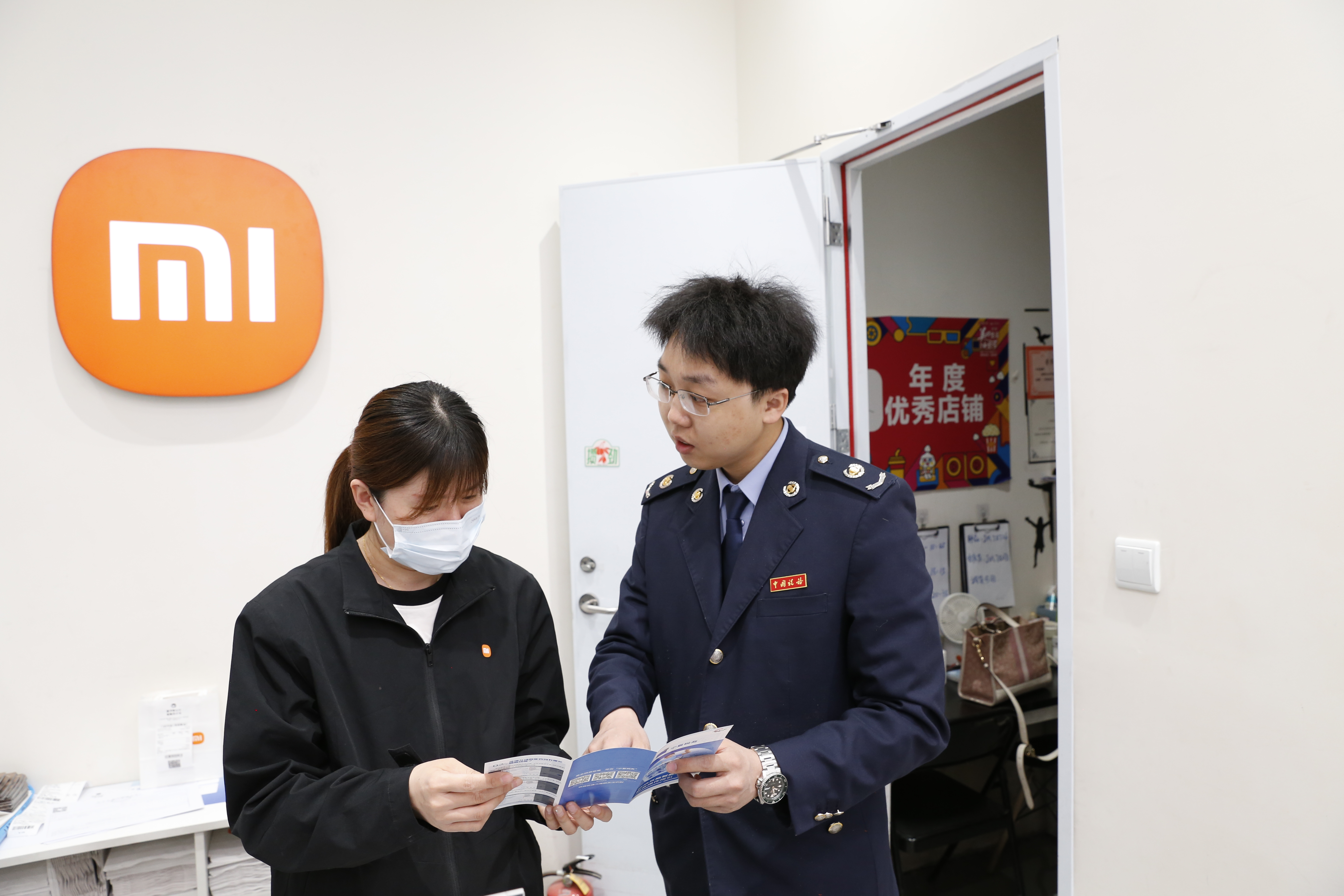 近日,大武口区税务局组织干部深入辖区个体工商户、小微企业等开展税费政策宣传活动。图为税务干部在小米授权店,向商户人员讲解最新税费优惠政策,解答涉税咨询,助力企业更好享受政策红利。
