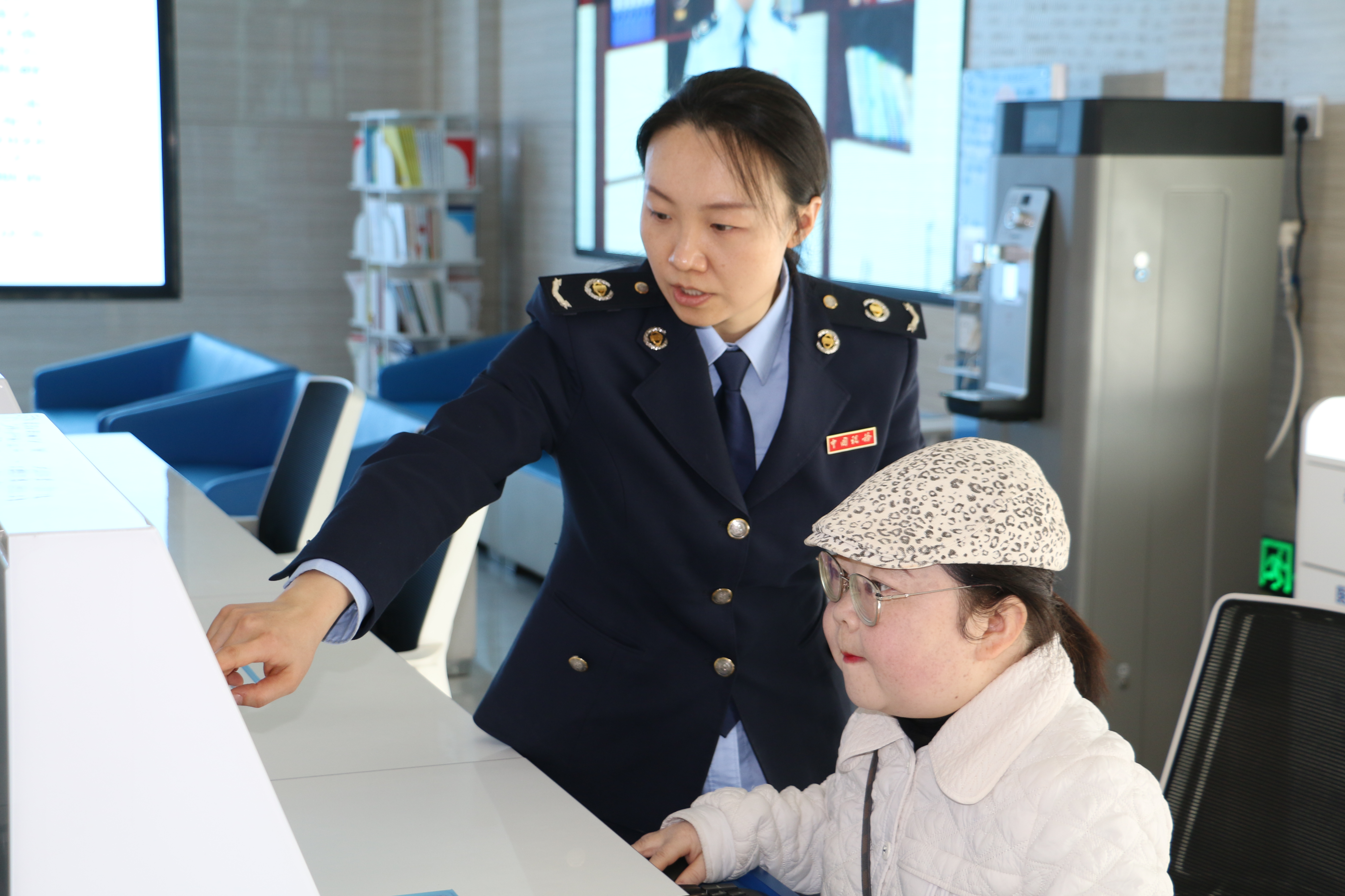 银川经济技术开发区税务局办税服务厅导税工作人员指导纳税人线上申报,耐心解答疑问,用通俗易懂的语言讲解政策,用细致周到的指引化解困惑,在真诚中拉近距离,让纳税人带着问题来,带着满意走。