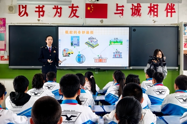 在全国第35个税收宣传月火热开展之际,灵武市税务局紧扣“税收·法治·公平”主题,组织青年税务干部走进灵武市第二小学,开展税收普法宣传活动。活动通过趣味税收动画、卡通课件、生活案例等形式,用通俗易懂的语言讲解税收起源、用途及意义。同时设置“税法知识大闯关”环节,让孩子们踊跃参与、积极分享,在轻松氛围中学习税法知识。
