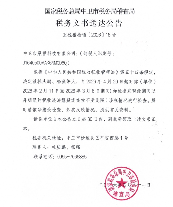 根据《中华人民共和国税收征收管理法实施细则》第一百零六条规定,国家税务总局中卫市税务局稽查局因采用其他送达方式无法向中卫市巢誉科技有限公司送达税务文书,现公告送达,自公告之日起30日内到我局领取文书,逾期视为送达。