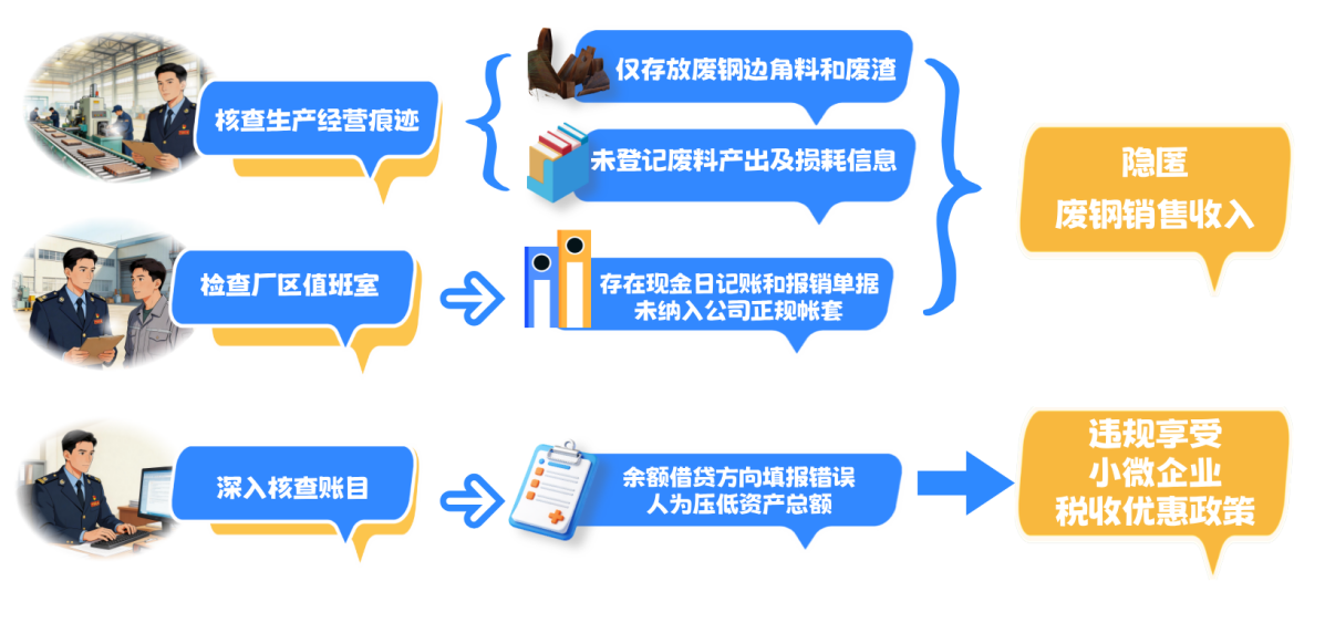 至此,该公司隐匿废料销售收入、违规享受小微企业税收优惠以及未按规定申报缴纳印花税等多类涉税问题终于真相大白。